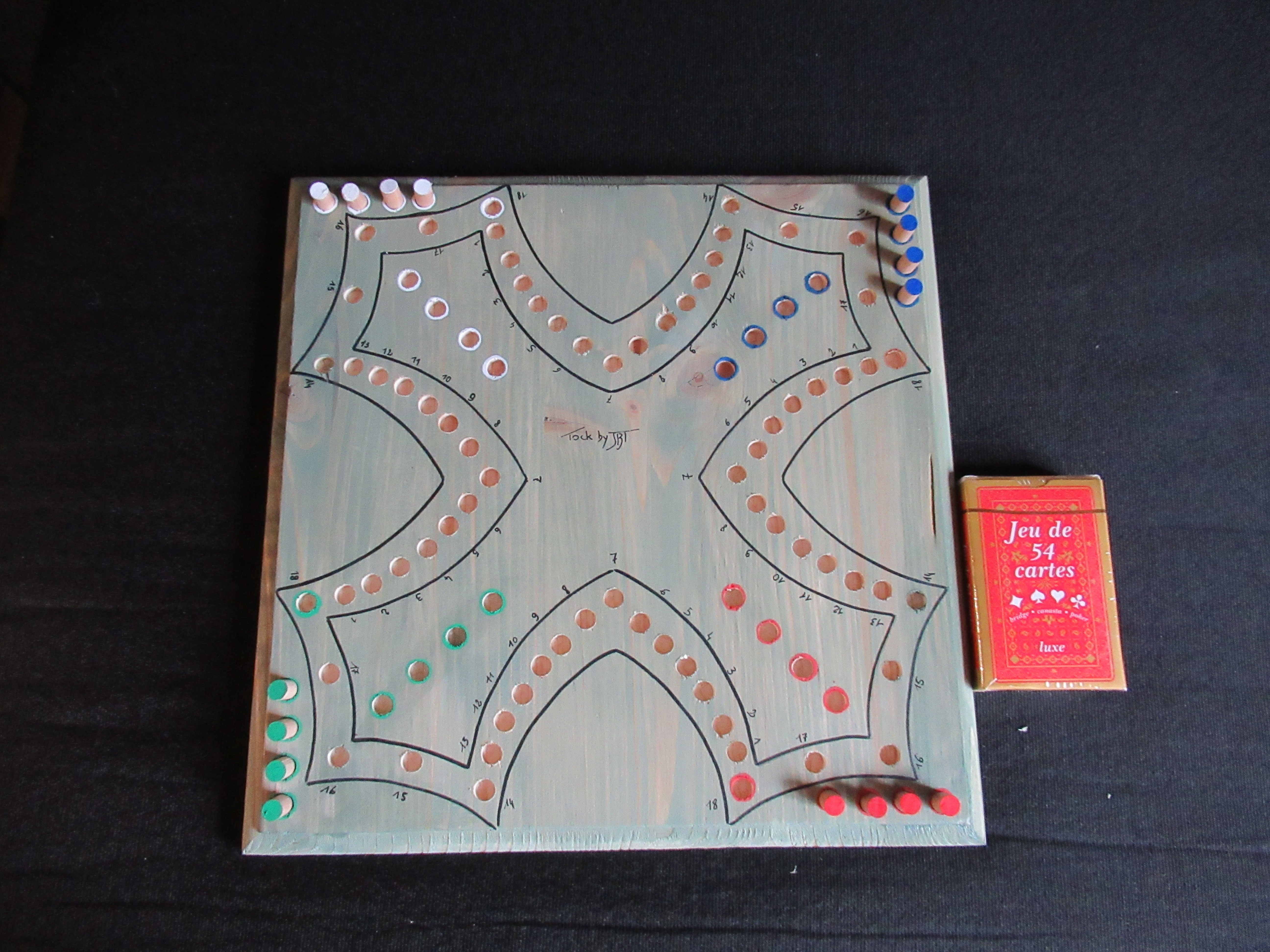 Matériel : un plateau 30x30 cm, 16 pions (4 blancs, 4 rouges, 4 verts, 4 bleus), un jeu de 54 cartes
